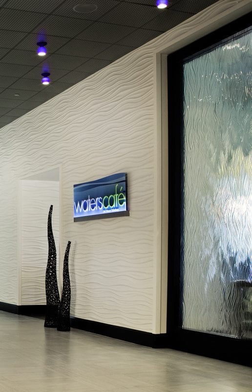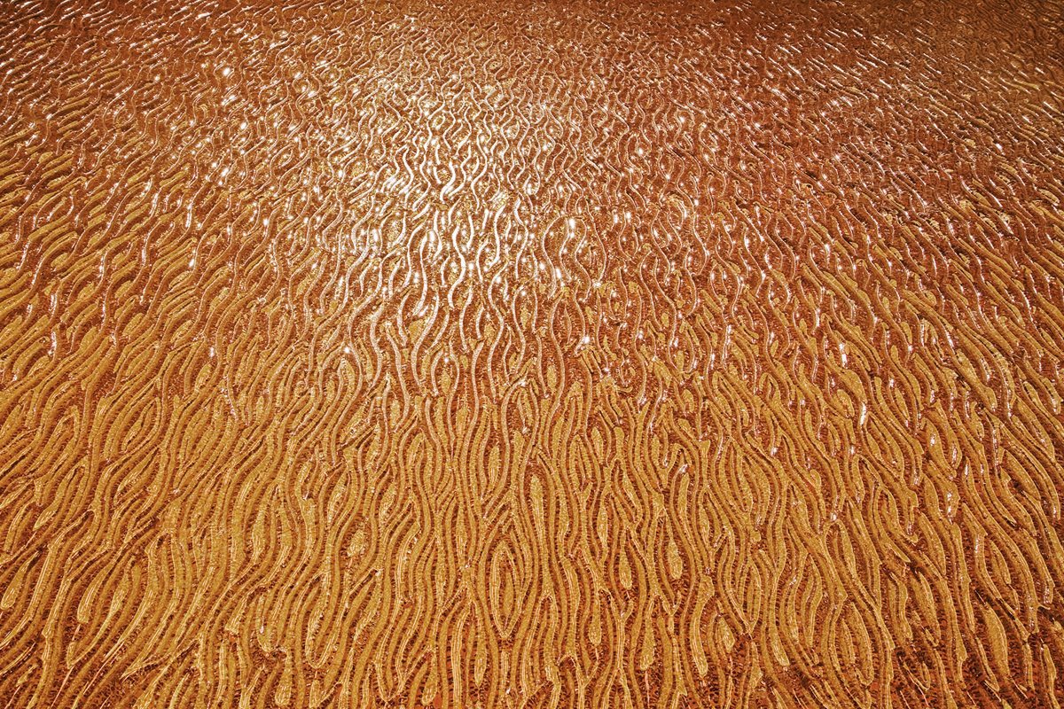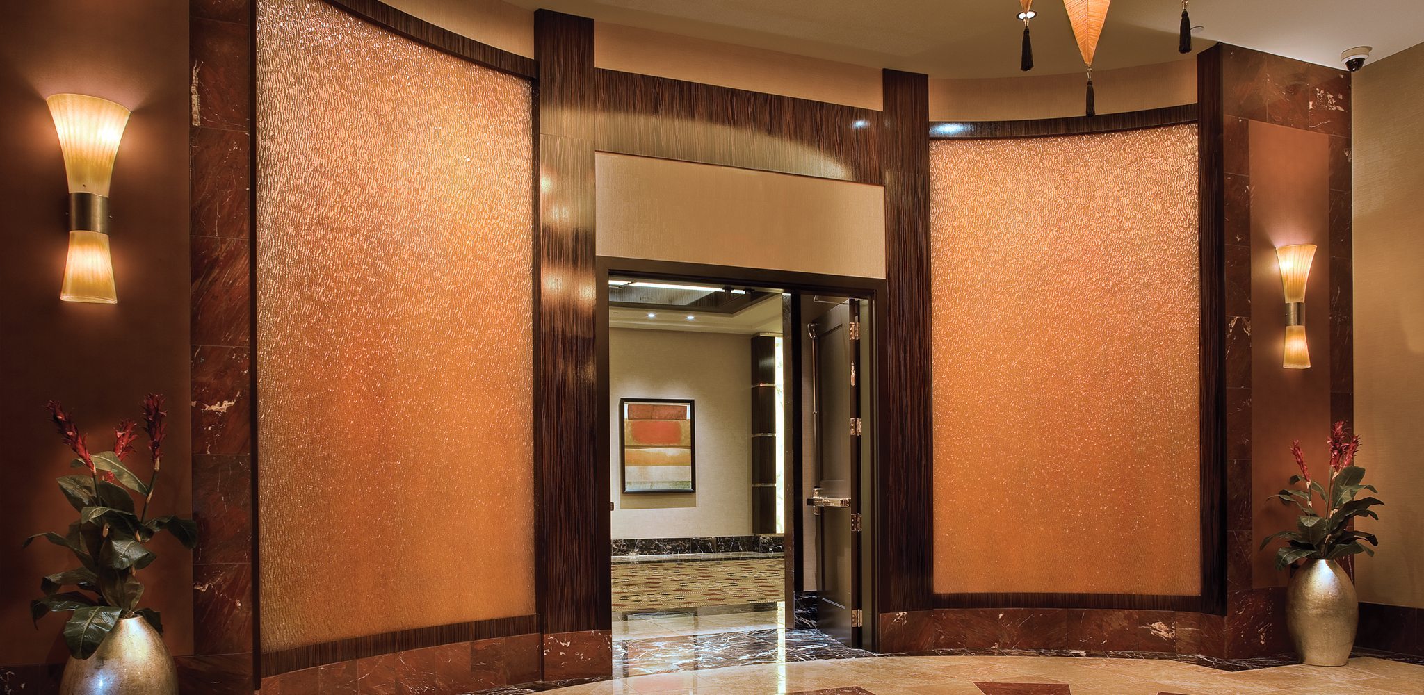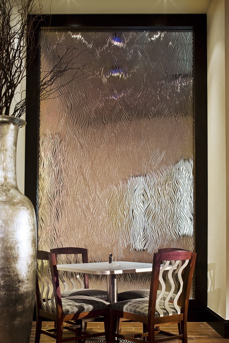 Crystal Cognac Architectural Glass is part of Nathan Allan’s exclusive Josiah J Collection. A deep, wavy, flowing pattern is formed on the front side of each glass panel. As such, the texture is pronounced and very noticeable. Thousands of miniature crystals are fused on the back side of each panel. When lighted, the crystals bring a subtle, elegant sparkle to the glass. At the same time, the crystals also help diffuse any obvious light sources. In addition to the beautiful texture and sparkling crystals, a beautiful, deep cognac color finish is applied. The cognac color is rich and warm, and elegantly matches the Casino’s rich décor.