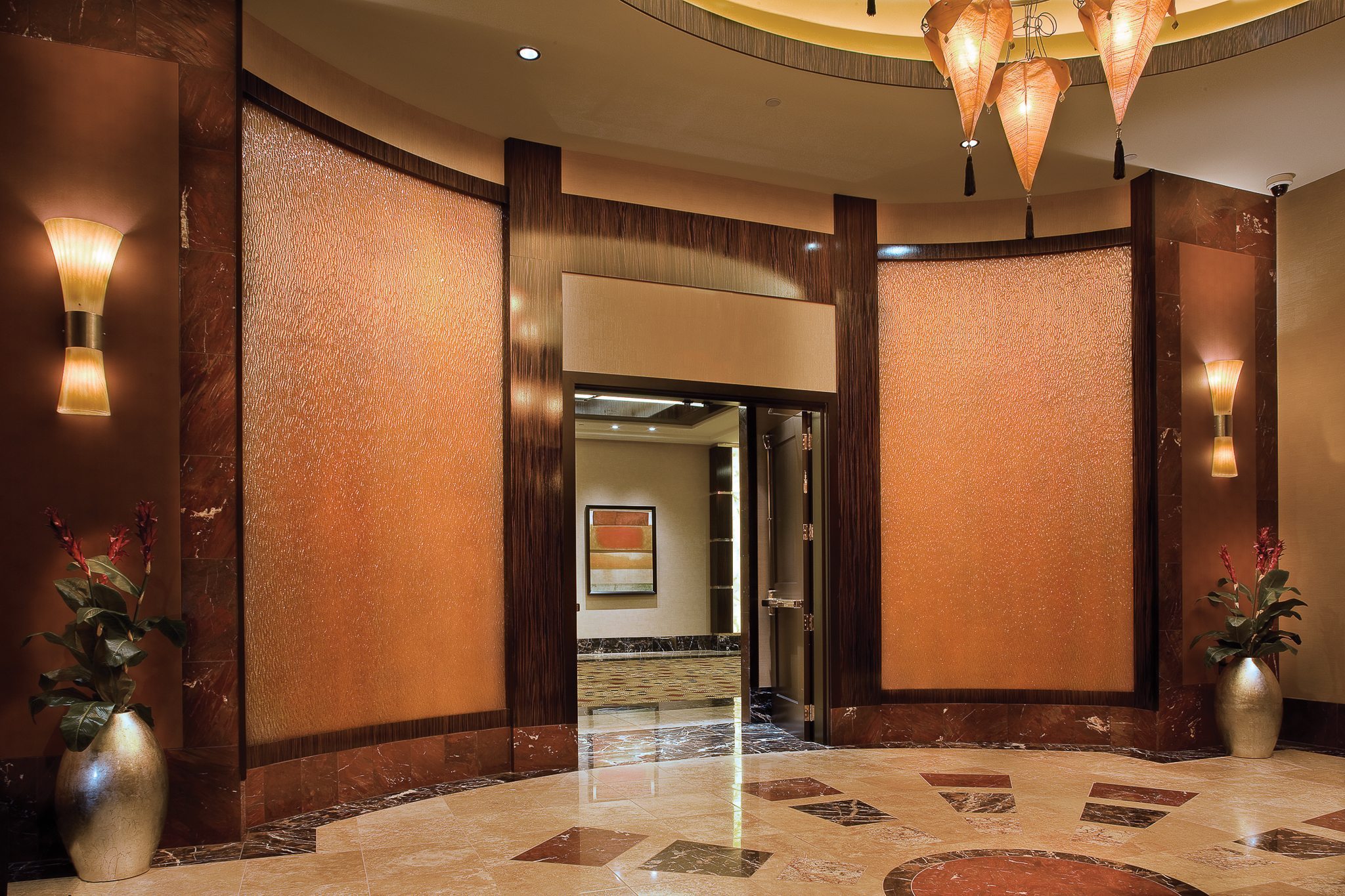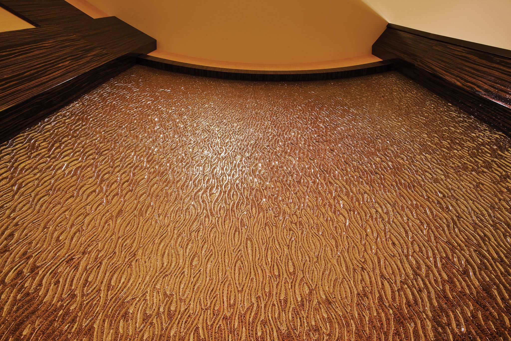 Because of the various different wall shapes and angles within the Casino, Nathan Allan was required to use both flat and bent glass panels. The flat glass panels fit seamlessly into a feature wall location, with the pattern in a continuous flow. The curved panels are strategically bent to tightly fit against the shaped walls of an exclusive entry. As well, the rich Cognac Color and vibrant crystals bring life and energy throughout the casino.
