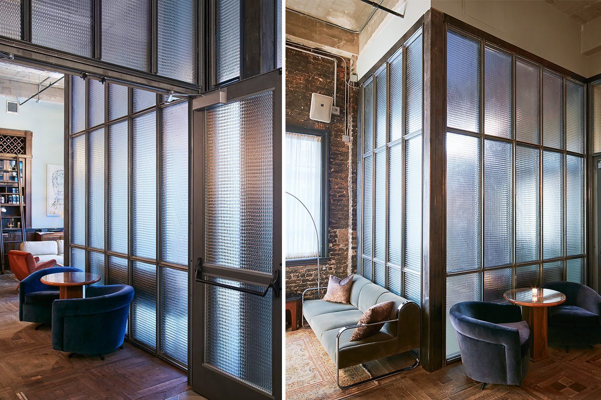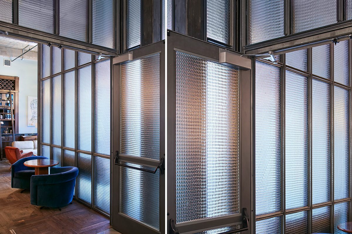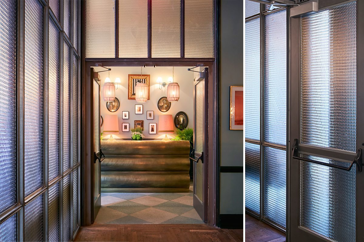 Ludlow House Glass Doors. Ludlow House is a members’ club in a former gold leaf factory located on New York’s Lower East Side. Reflecting the neighborhood’s playful, vibrant energy, the space was designed by Soho House & Co’s in-house design team, featuring Nathan Allan’s textured glass doors as part of the entrance and reception design. Founded in London in 1995 as a private members’ club for people in the creative industries, Soho House & Co has since opened clubs across Europe and North America, as well as restaurants, cinemas, work spaces, spas, and bedrooms.
