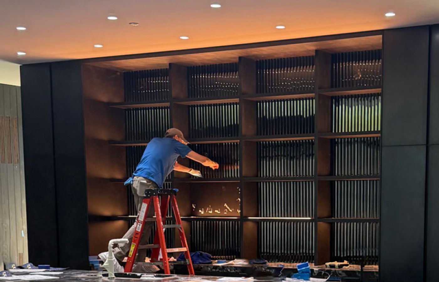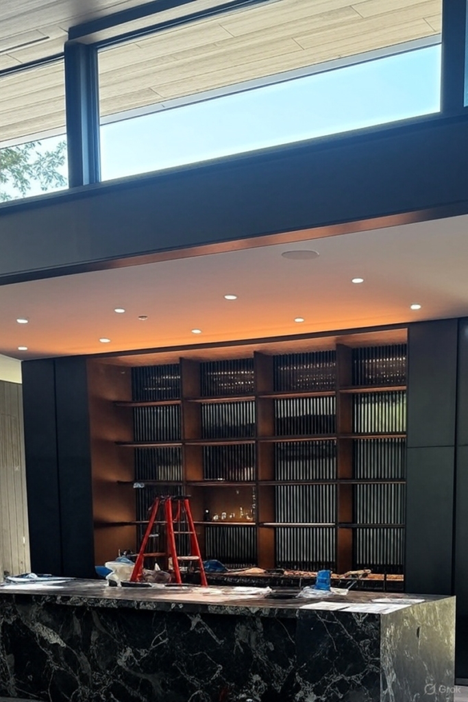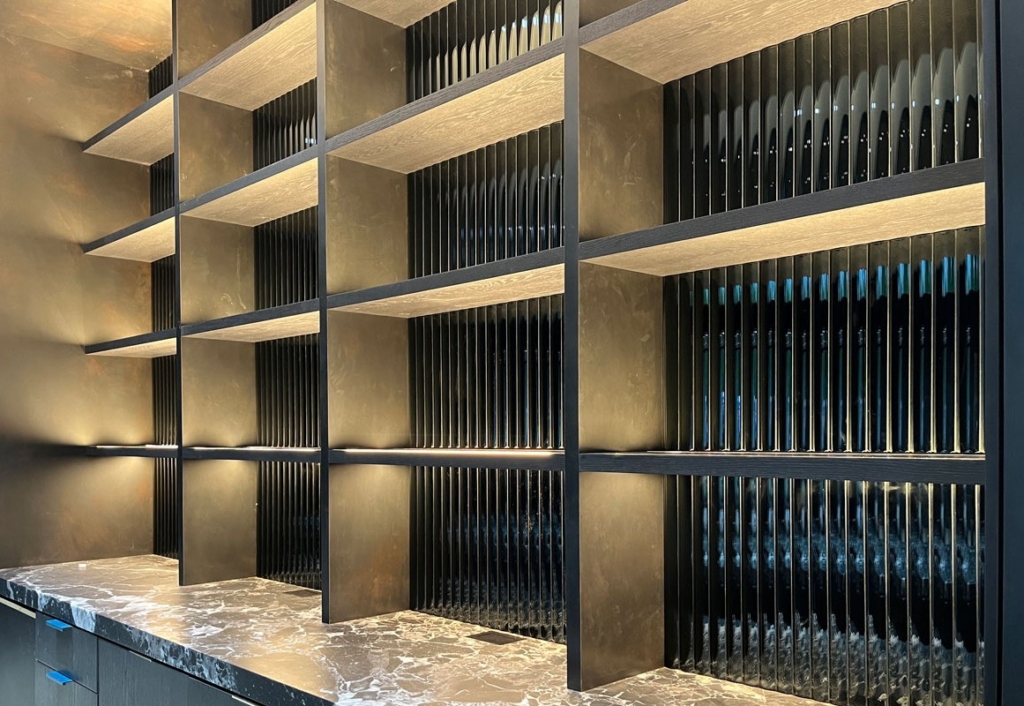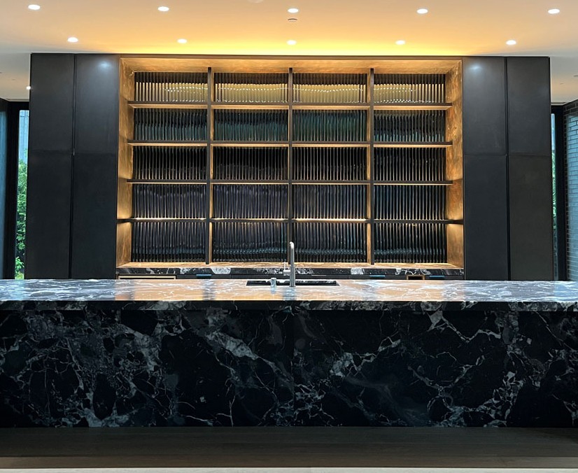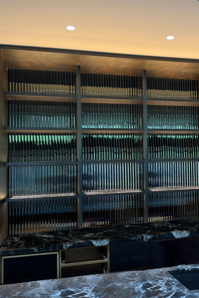 The installation of the Cathedral Black Silvered Glass for this private project was expertly executed by Distinctive Glass in Lynwood, WA, showcasing precision and craftsmanship. Utilizing Nathan Allan’s specialized adhesive, the 10mm (3/8”) black tempered safety glass with a silvered backing was seamlessly adhered to the back surface, ensuring a secure and durable fit ideal for cladding applications. The protective coating on the glass’s back facilitated a smooth installation process, allowing the 30” x 18” (762mm x 457mm) panels to be perfectly aligned, enhancing the reflective Cathedral texture and creating a stunning visual impact in the back bar setting.
