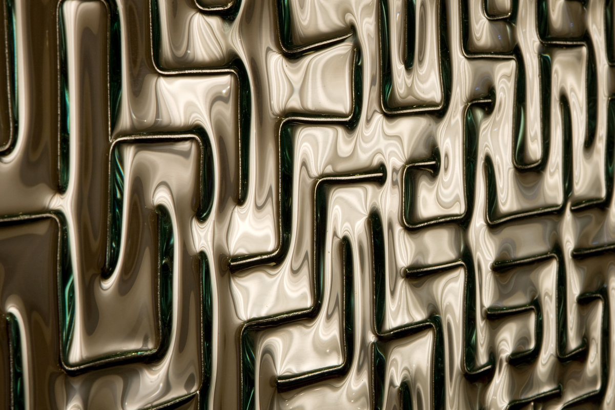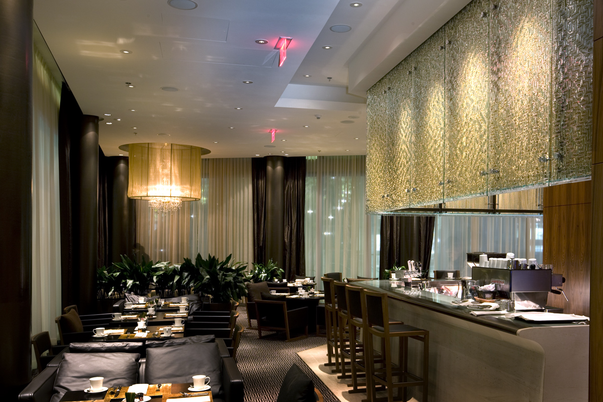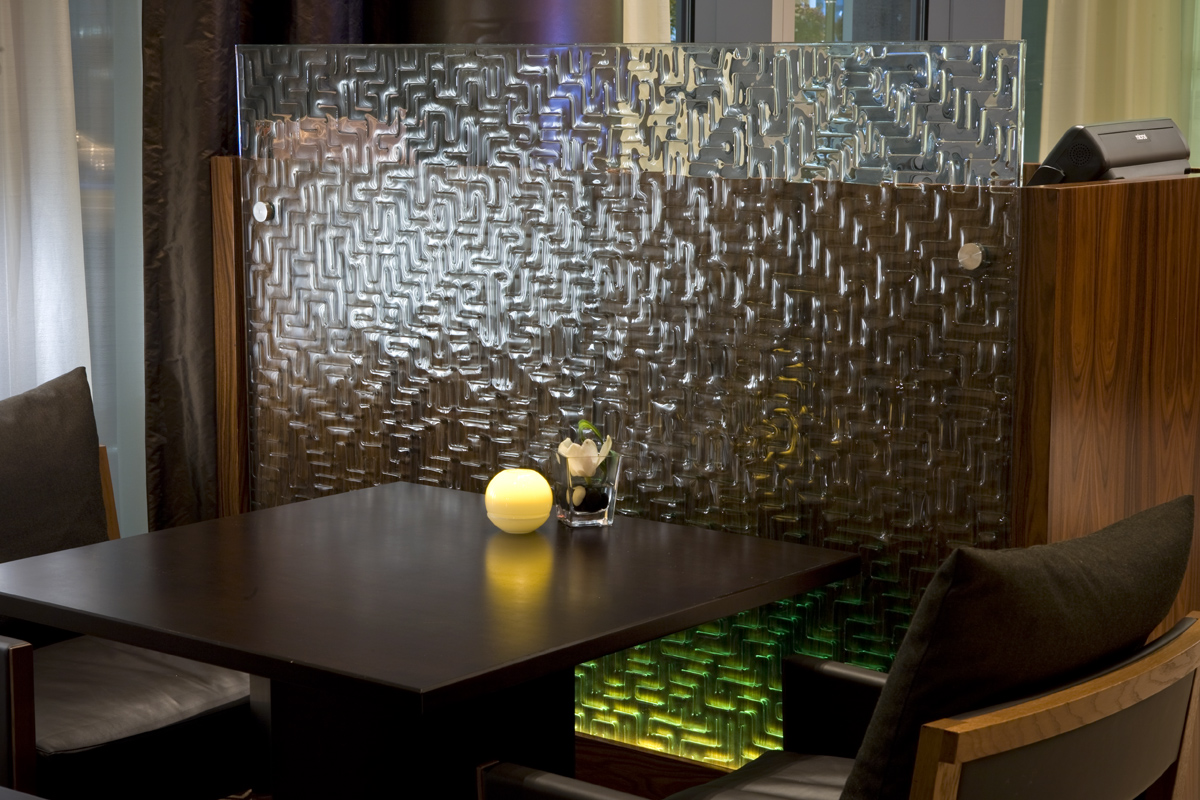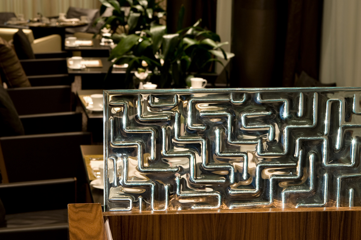 Shangri La Hotel Freeform Maze. CHIL designers comment how perfect our Freeform Maze pattern complimented other materials in this fine dining restaurant at the Shangri-La Hotel. Using 3/8” thick clear tempered glass, multiple panels are attached to the ceiling to form an overhead lighting canopy. A matching divider panel provides privacy behind the hostess podium.