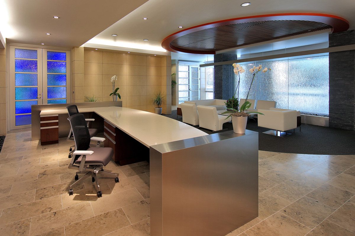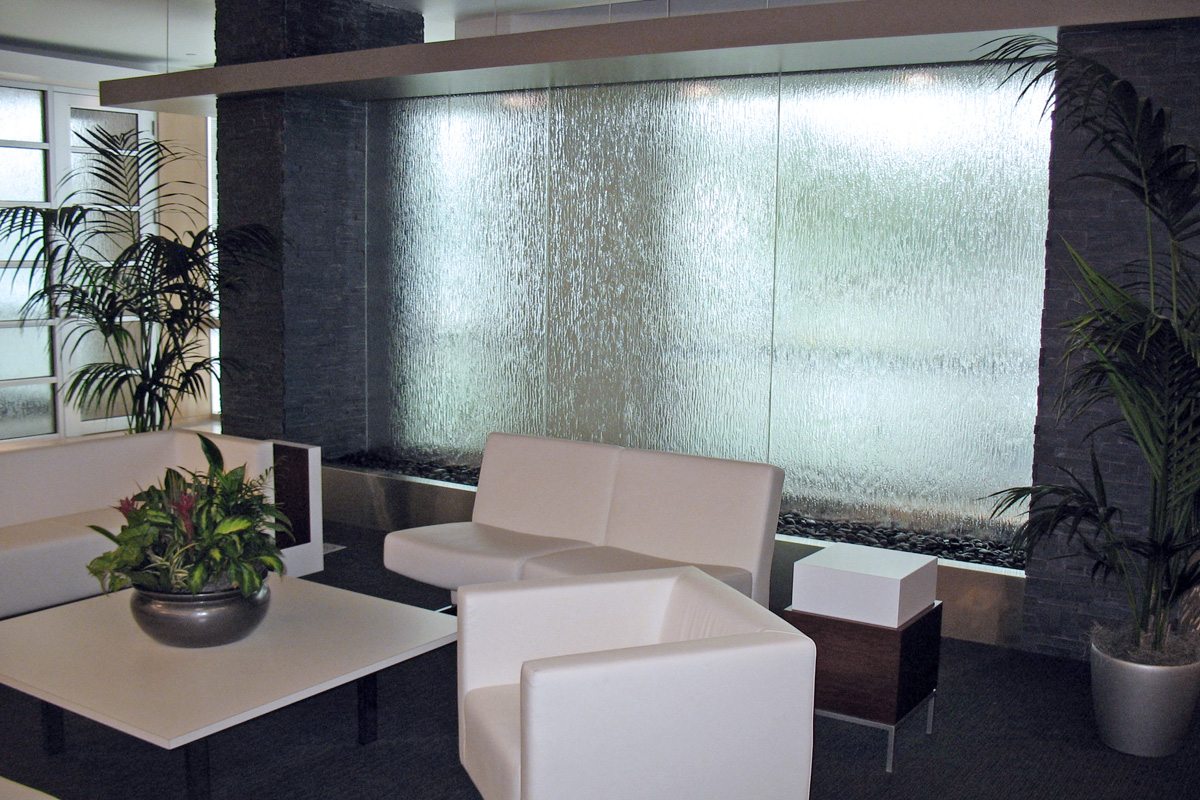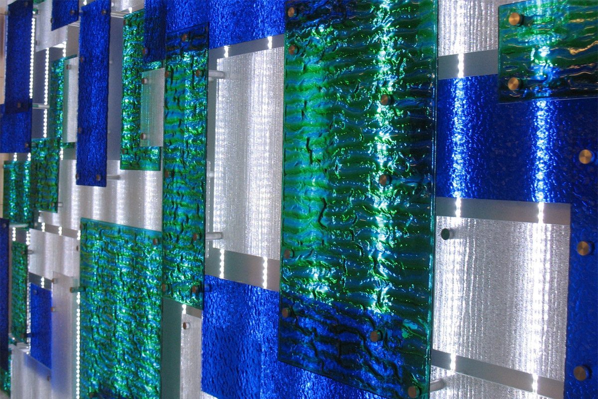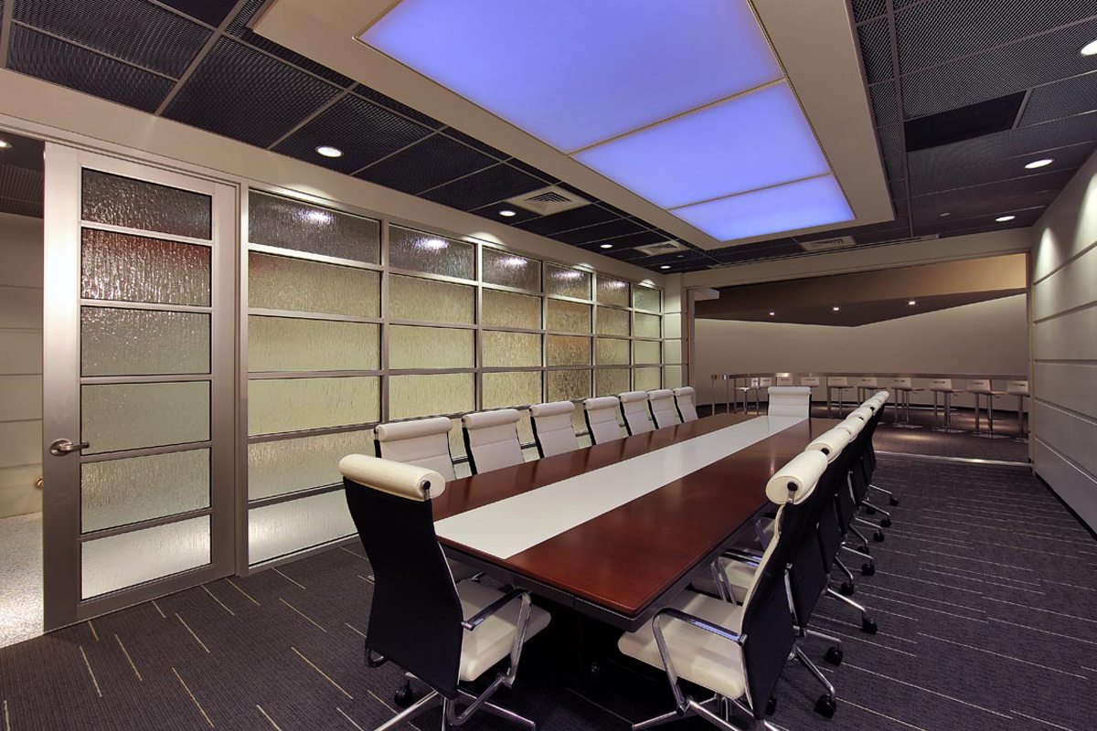 B2SJ’s designers chose several textures and colors, varying the depths of panels using differing lengths of standoffs. The panels serve to diffuse the backlighting and provide a dynamic backdrop representing the firm’s multifacted yet integrated services. Sierra Nevada Corporation Textured Glass Walls.